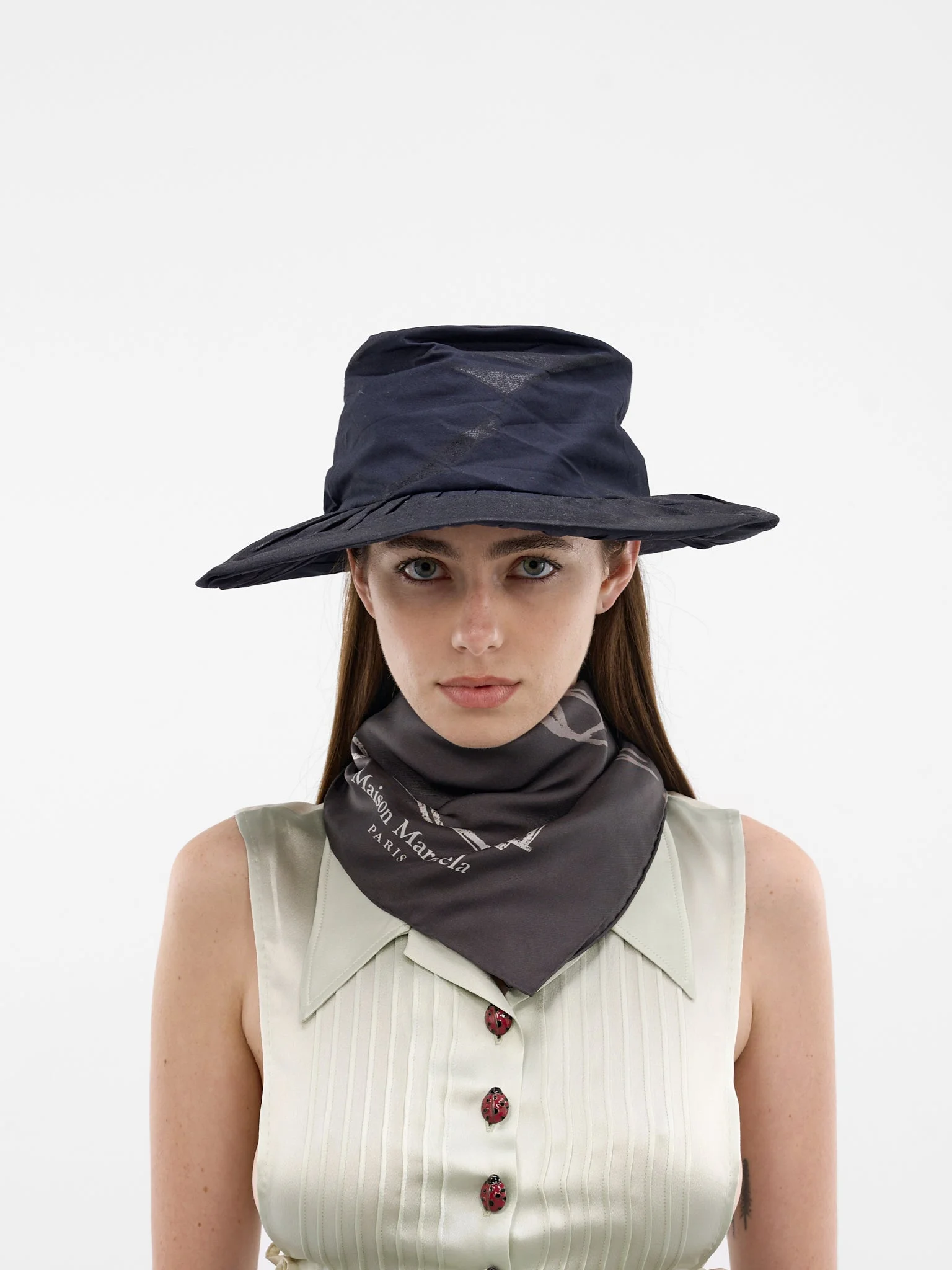 Stone-washed cotton wide-brimmed hat with pressed and foiled sheen and crown pleats. Featuring: • Wide brim • Bow detail on the side • Four stitches at the back • Made in Italy • Primary: 100% Cotton | Lining: 100% Polyester • Standard sizing