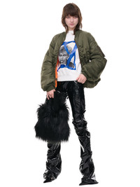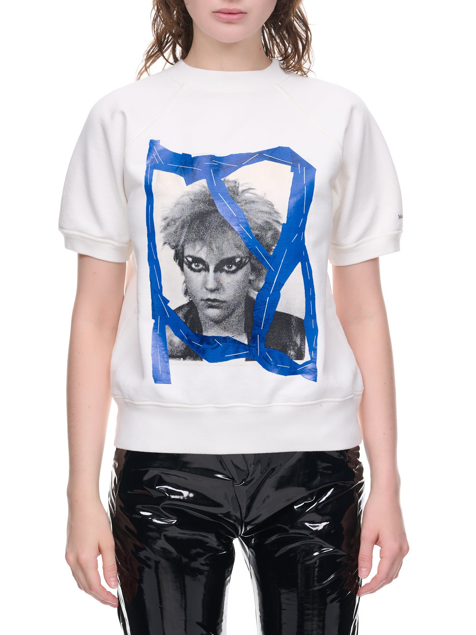 MAISON MARGIELA sweater in white, printed graphic, crewneck, short sleeves, branded sleeve, relaxed fit. Made in Portugal Standard Sizing 100% Cotton Model is 5'9" wearing size XS. Bust: 33" Waist: 24" Hip: 33"