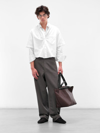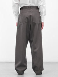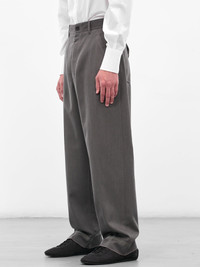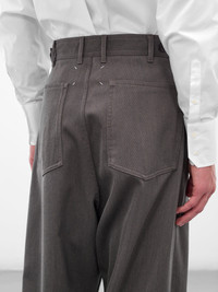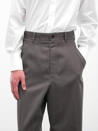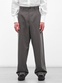 These grey virgin wool trousers crafted with sculptural volume, a wide leg, and tailored with jeans details. Maison Margiela’s four signature white stitches accent the back for a subversive finish. Featuring: • Wide leg and baggy fit • Band at cuffs • Belt loops • Button and zip fly closure • Inset side and back patch pockets • Four signature stitches at the back • Made in Italy • 100% Virgin Wool • Italian sizing Model is 6'2" wearing size 48. Shoulders: 19" Chest: 38" Waist: 30"