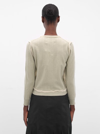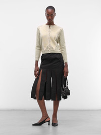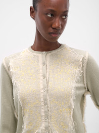 A fitted virgin wool cardigan framed with contrast applique patches that mimic the reverse side of embroidered fabric. Finished with ribbed trims, raw-edged overlays, and Maison Margiela’s signature four stitches at the back. Featuring: • Slim fit • Virgin wool construction • Contrast applique patches • Overlay with raw-edged embroidered panels • Button-through front • Ribbed cuffs and hem • Signature four stitches at back • Made in Italy • Primary: 100% Virgin wool | Secondary: 54% Acetate 26% Polyamide-Nylon 20% Silk | Secondary: 100% Cotton • Standard sizing Model is 5'11" wearing size S. Bust: 31.4" Waist: 24.8" Hips: 35"