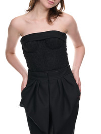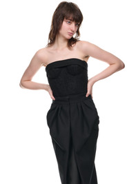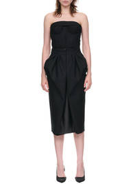 MAISON MARGIELA dress in black, herringbone wool, built-in corset, strapless, back zip fastening, reworked skirt, pleated design, back vent, signature stitch detail, tailored fit. Made in Italy Italian Sizing Main - 100% Wool Second - 48% Mohair, 40% Virgin Wool, 12% Nylon Coating - 100% Polyurethane Lining - 100% Cupro Model is 5'9" wearing size 40. Bust: 33" Waist: 24" Hip: 33"