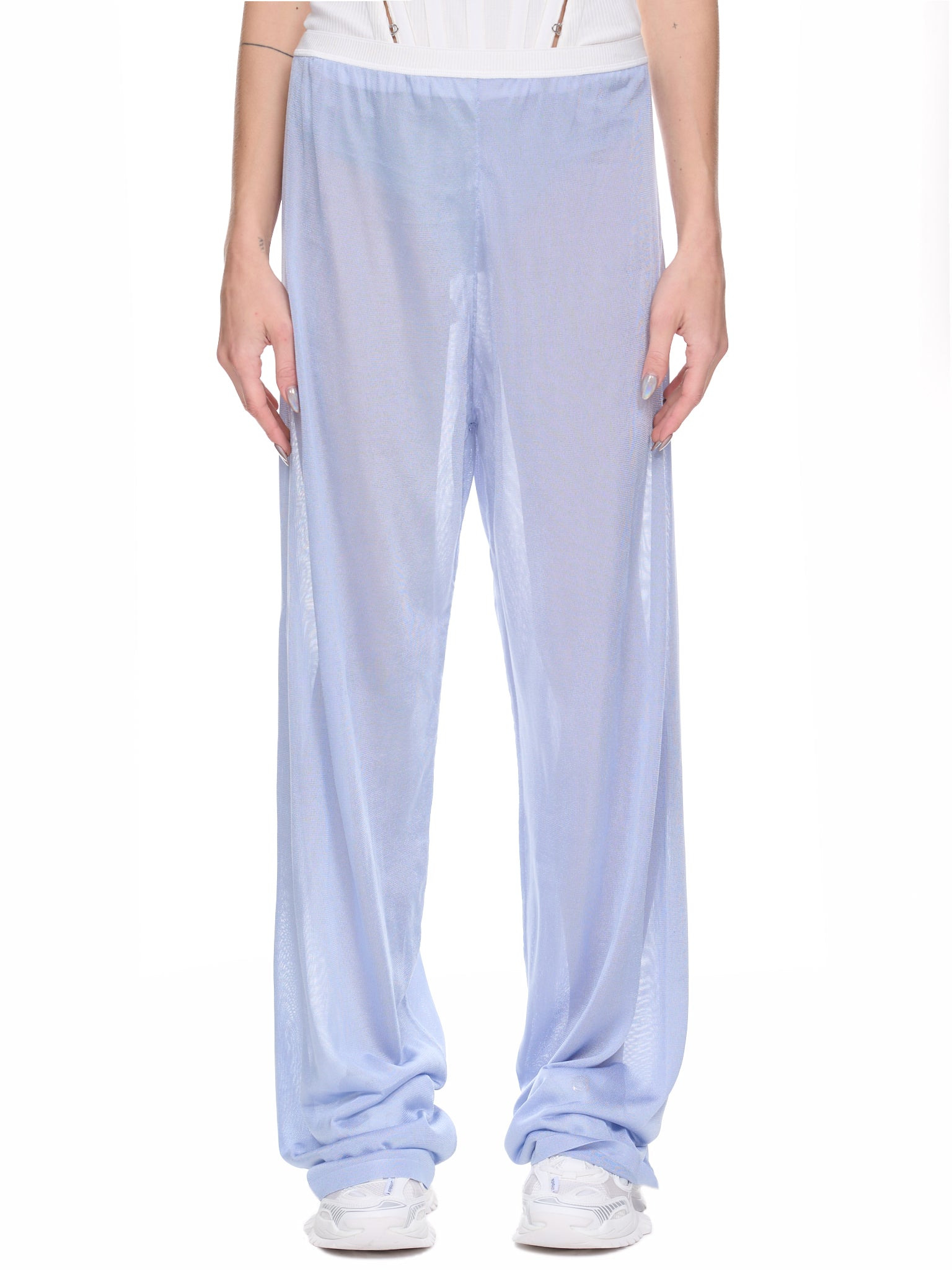 MAISON MARGIELA pants in blue, metallic sheen knit, semi-sheer, contrast mid-elastic waist, straight leg, relaxed fit. Standard Sizing Model is 5'9" wearing size S. Bust: 33" Waist: 24" Hip: 33"