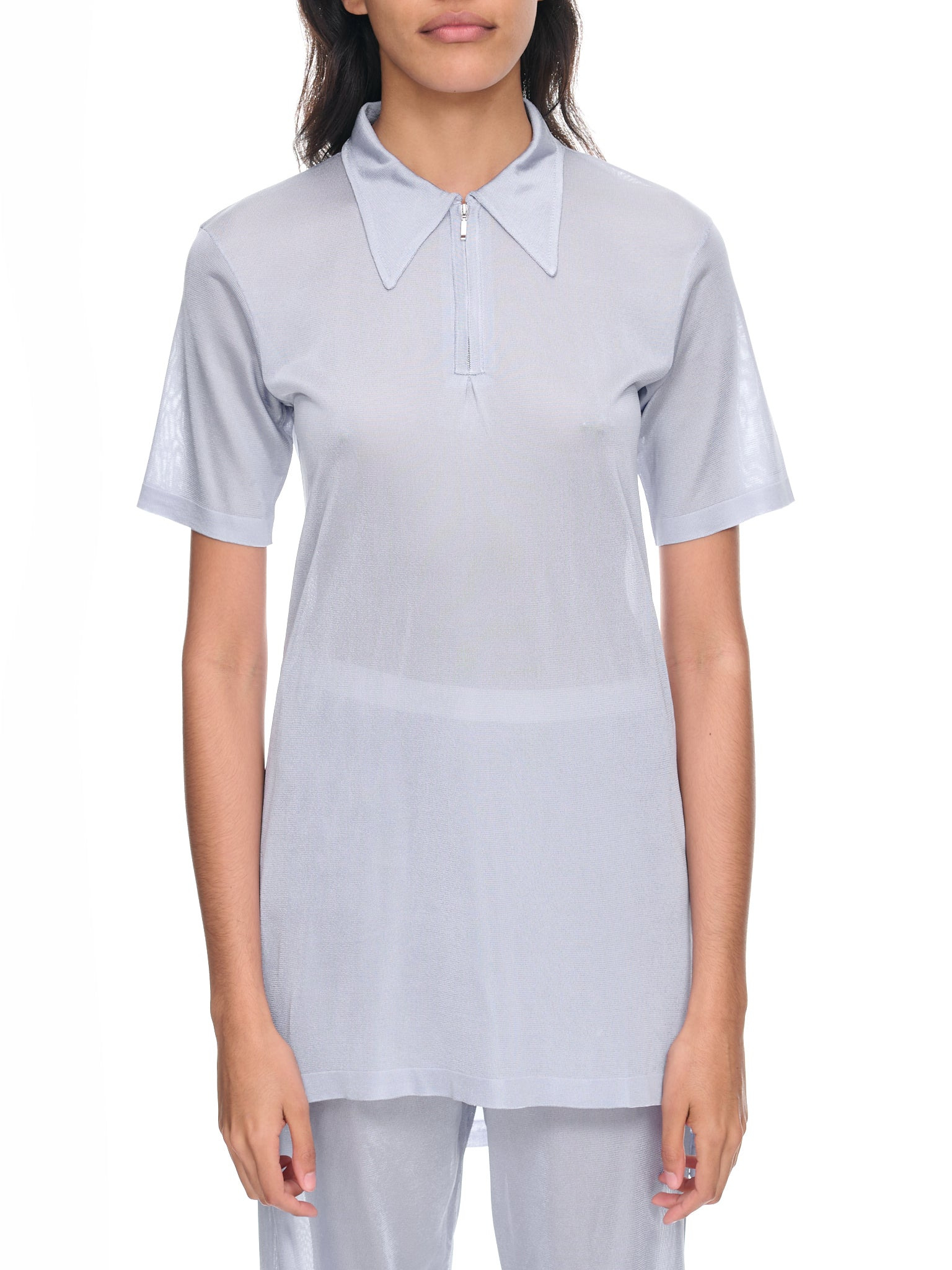 MAISON MARGIELA shirt in blue, polo design, pointed collar, half-zip closure, short sleeves, full length, asymmetric hem, slim fit. Standard Sizing Model is 5'10" wearing size S. Bust: 32" Waist: 25" Hips: 35"