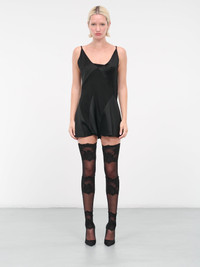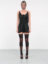 MAISON MARGIELA jumpsuit in black, asymmetric paneled satin construction, v-neckline, shoulder straps, armscyes, back signature stitching, asymmetric draping, ruffled hem, mini-length, fitted. Made in Italy 52% Viscose 48% Acetate Italian Sizing Model is 5'9" wearing size 40. Bust: 32" Waist: 24" Hips: 34"