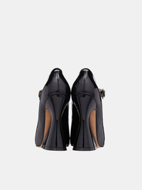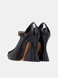 MAISON MARGIELA heels in black, mary-jane style pump design, patent leather construction, back signature stitch detailing, adjustable pin-buckle strap, open toe, rounded toe, modified block heel, embossed footbed, leather sole. Made in Italy Outer: 100% Calf Leather Inner: 100% Sheep Leather Sole: 100% Calf Leather Contrast: 100% Rubber European Sizing