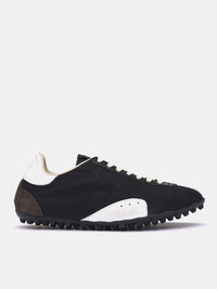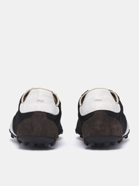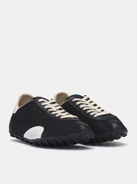 MAISON MARGIELA sneakers in black & white, textile upper construction, contrast leather paneling, low-top, lace-up fastening, signature numeric branded tongue patch, heel signature stitch detailing, rounded toe & leather paneling, rubber sole, lined. Made in Italy Upper: 54% Polyester 46% Cotton Contrast: 100% Calf Leather Lining: 100% Polyester Interior: 100% Calf Leather Sole: 100% Rubber European Sizing