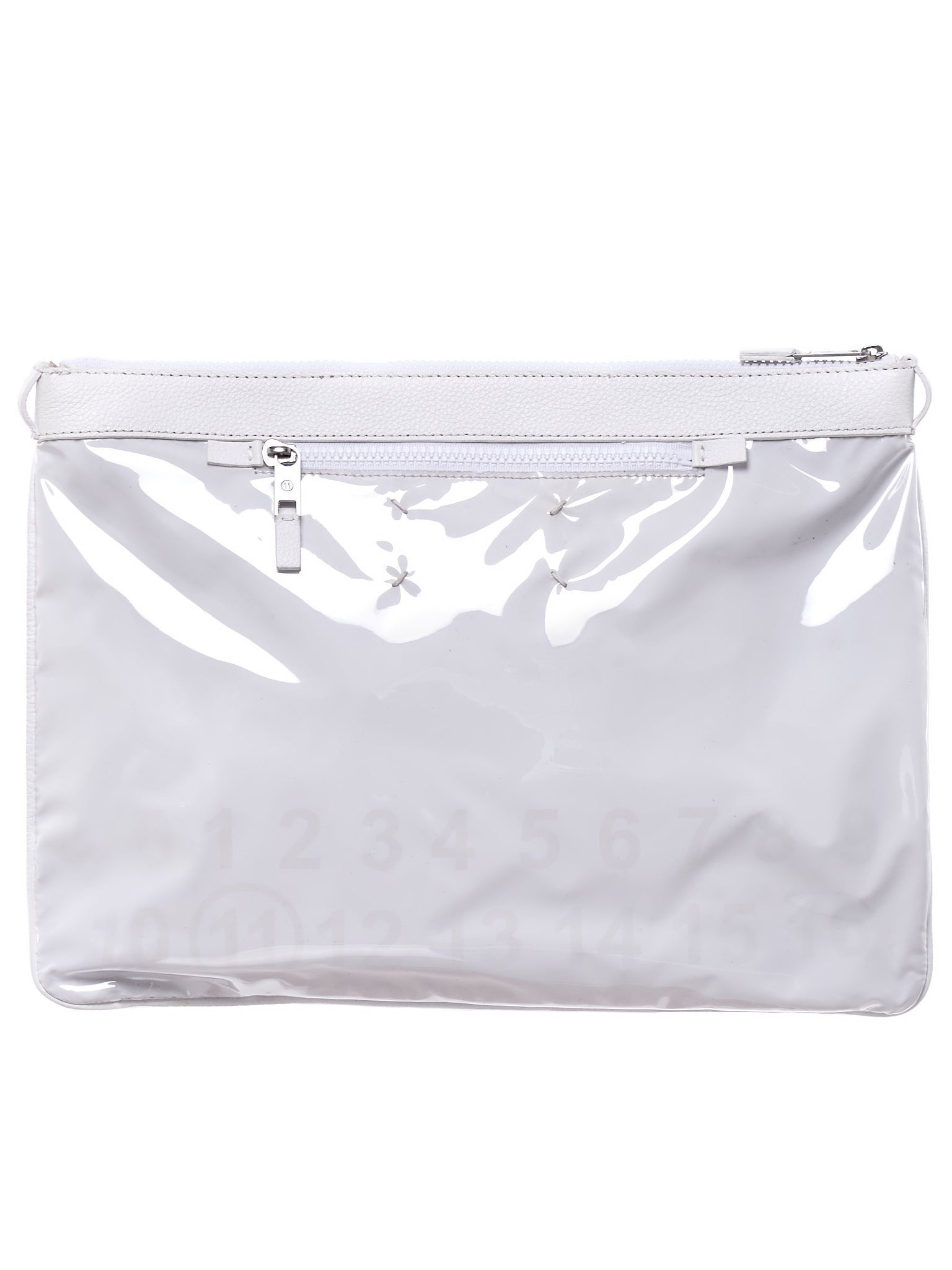 Maison Margiela pebbled leather pouch in white, one-sided polyurethane overlay, main top zip compartment, side zip pocket, tonal stitching. Made in Italy. Composition - Leather/Polyurethane One size.