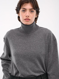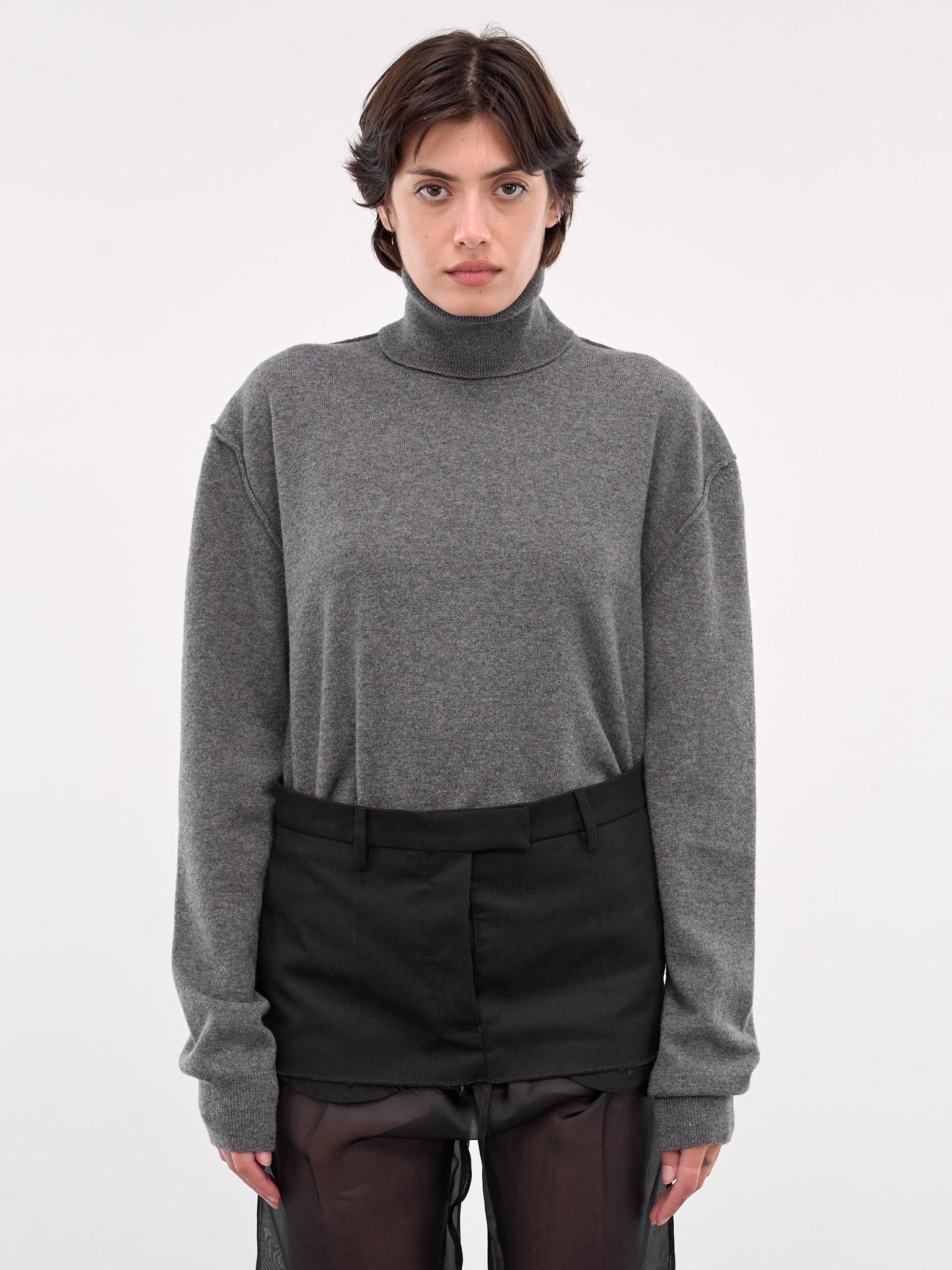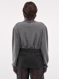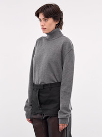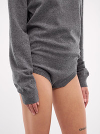 MAISON MARGIELA bodysuit in grey, paneled wool knit construction, turtleneck, back signature stitch detailing, long sleeves, rib-knit collar & cuffs, relaxed fit. Made in Italy 100% Wool Standard Sizing Model is 5'8" wearing size S. Bust: 32" Waist: 24" Hips: 36"