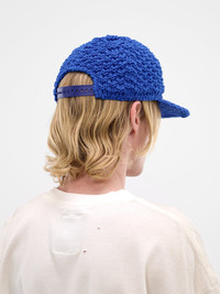 Blue baseball cap constructed in a cotton-acrylic crochet knit with embroidered branding. Featuring: • Cotton-acrylic crochet knit construction • Baseball cap–inspired silhouette • Embroidered “LA” detail • Curved brim with logo tag • Adjustable snapback closure • Made in Japan • 50% Cotton 50% Acrylic • One size