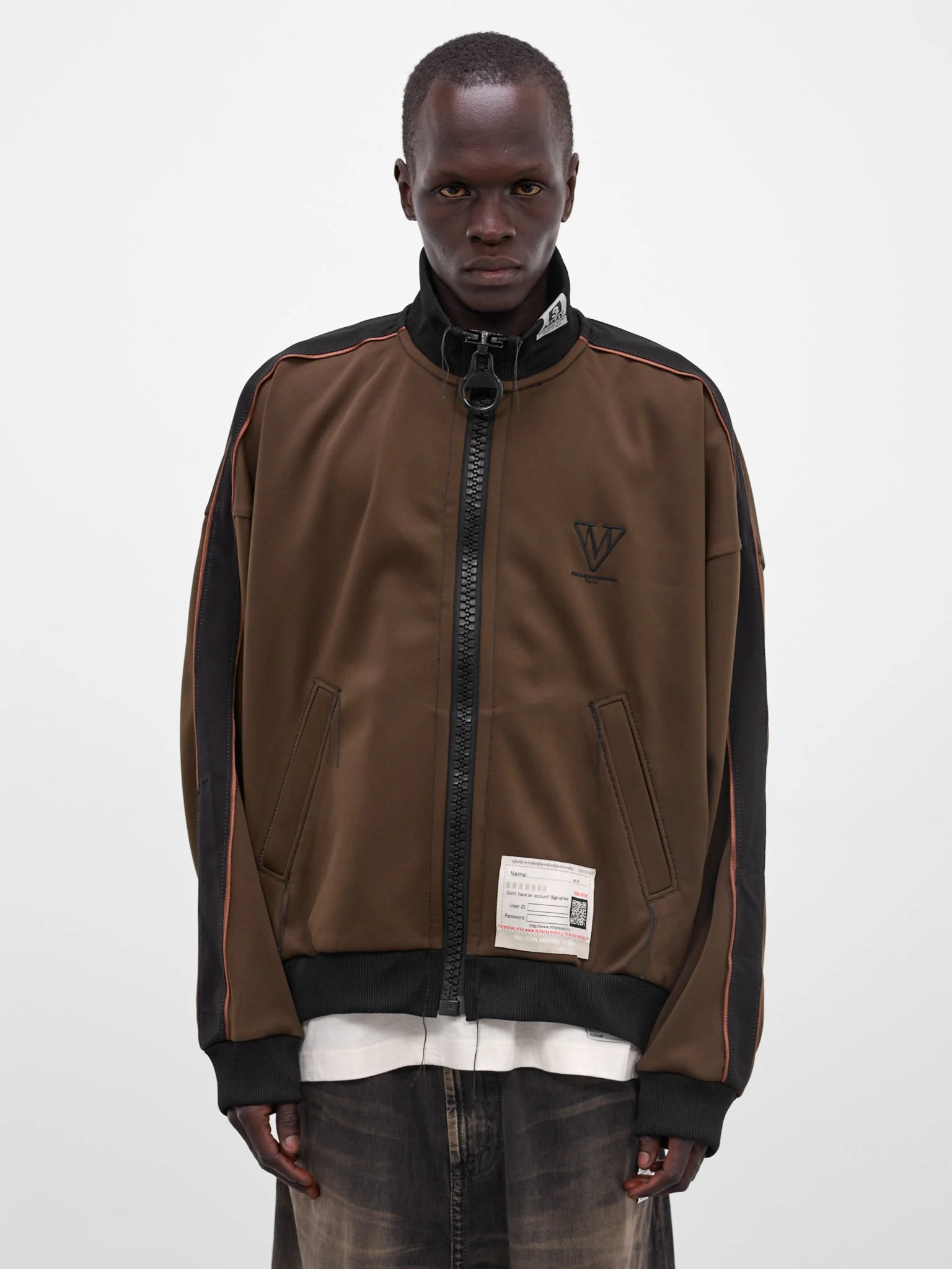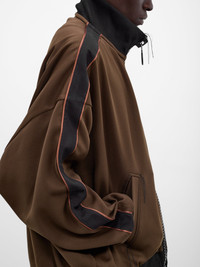 Black and brown track jacket with amateur sewing design and signature oversized zip. Featuring: • Oversized fit • Track jacket design • Ribbed stand collar with logo tag • Front zip closure and signature oversized zip • Loose thread detailing and dropped shoulders • Long sleeves with piping and rib-knit cuffs • Logo embroidery at chest and logo patch at hem • Side welt pockets • Made in China • 100% Polyester • Italian sizing Model is 5'11.5" wearing size 48. Shoulders: 16" Chest: 32.5" Waist: 30"