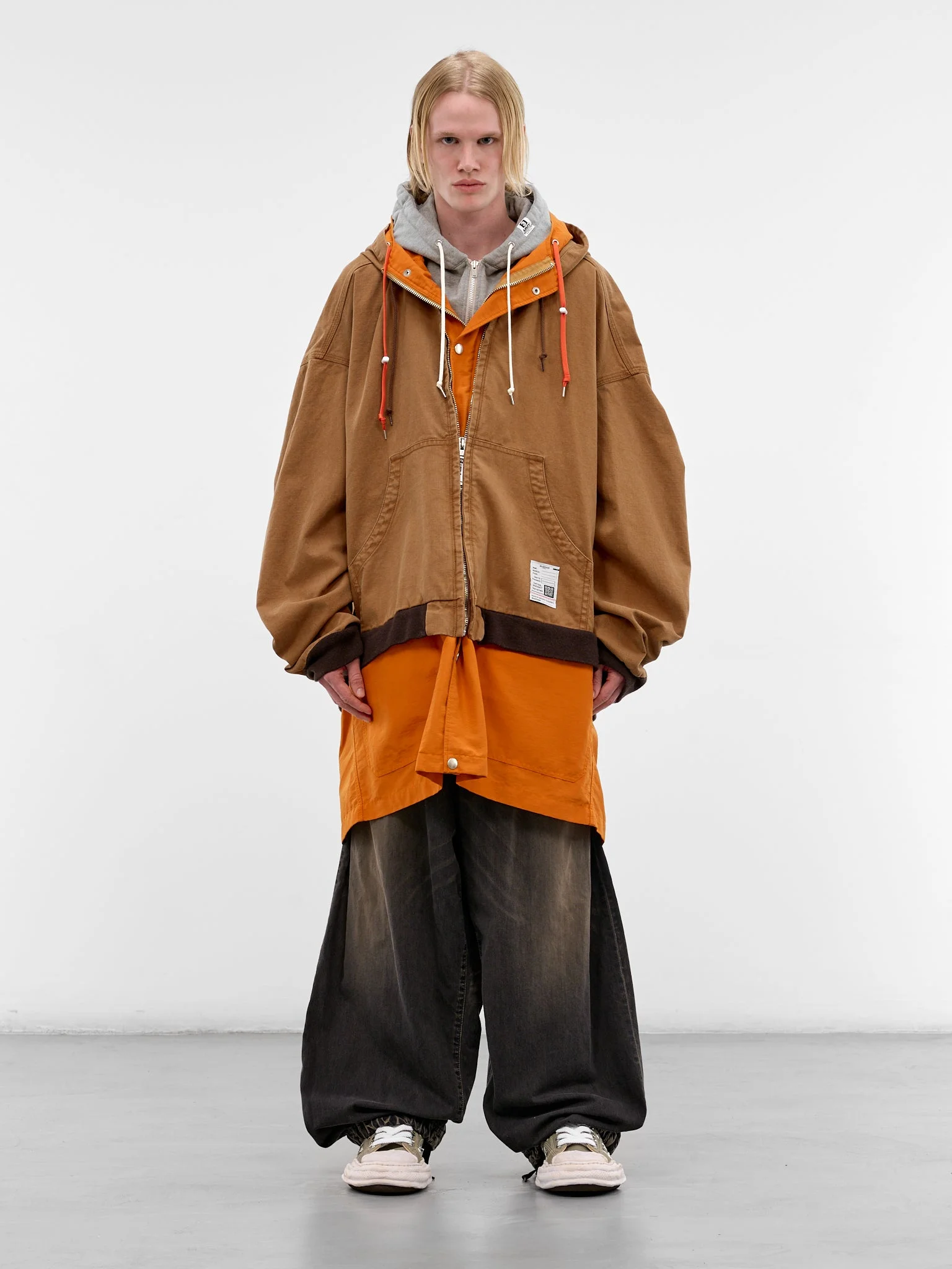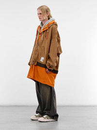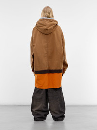 Brown and orange coat constructed in layered cotton with trompe l’oeil hoodie detailing and oversized volume. Featuring: • Oversized fit • Layered cotton construction • Trompe l’oeil layered hoodies • Triple hood with drawstrings • Logo tag at hood • Triple layered zip closures • Dropped shoulders • Long sleeves • Rib-knit cuffs and outer layer hem • Front patch pockets with logo patch • Layered hems • Mid length • Made in China • 100% Cotton • Italian sizing Model is 6'0" wearing size 50. Shoulders: 19" Chest: 35" Waist: 28"