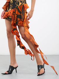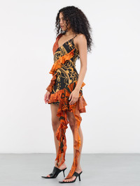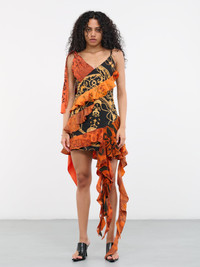 MARINE SERRE dress in orange, up-cycled scarves, ornament moon tapisserie print, v-neck, adjustable straps, concealed side zip closure, hook fastening, asymmetric frilled band, mini length, slim fit. Made in France Italian Sizing 100% Silk Model is 5'7.5" wearing size 36. Bust: 32" Waist: 24" Hips: 34"