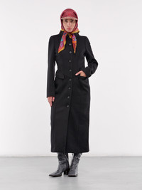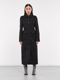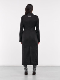 MARINE SERRE coat in black, paneled wool construction, spread collar, front button closure, back logo patch, long sleeves, side flap pockets, back vent, straight hem, lined, maxi-length, tailored fit. Made in Italy Outer: 100% Wool Inner: 100% Viscose French Sizing Model is 5'6" wearing size 36. Bust: 31" Waist: 24" Hips: 34"