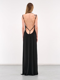 MARINE SERRE dress in black, paneled jersey construction, draping throughout, straight neckline, halterneck & shoulder straps, sleeveless, armscyes, deep open back & thong detailing, back gold-tone logo hardware, short train, floor-length, slim fit Made in Italy 92% Viscose 8% Elastane Standard Sizing Model is 5'9" wearing size S. Bust: 32" Waist: 23" Hips: 34"