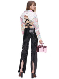 Marine Serre shirt in multicolor, point collar, button closure & cuffs, slight drop shoulder, tonal stitching, back branded stitching, open back with lace tie detail. Made in France European Sizing Composition: (Main) 100% Cotton, (Secondary) 62% Recycled Polyester, 38% Polyester Model is 5'10" and is wearing size 36. Bust: 32” Waist: 25” Hip: 34"