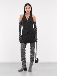 MARINE SERRE vest in black, viscose-wool blend, paneled construction, signature moon jacquard knit pattern, halterneck, front button closure, sleeveless, armscyes, open back, front welt pocket, straight hem, slim fit. Made in Italy 79% Viscose 20% Wool 1% Elastane French Sizing Model is 5'6" wearing size 36. Bust: 31" Waist: 24" Hips: 34"