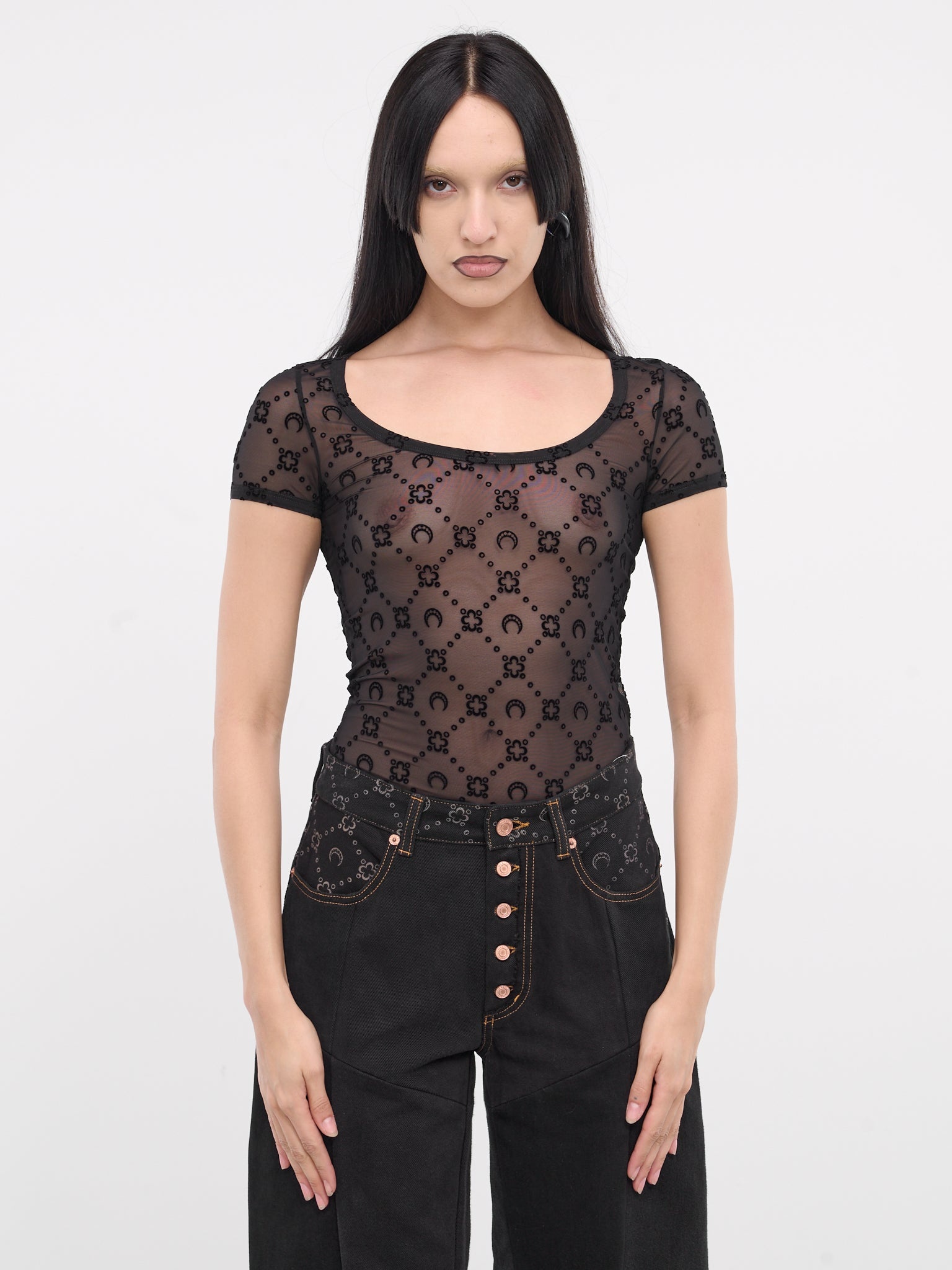 MARINE SERRE top in black, paneled mesh construction, sheer, logo monogram print, scoop neck, short sleeves, side logo flag, straight hem, slim fit. Made in France 86% Polyamide 14% Elastane Standard Sizing Model is 5'8" wearing size XS. Bust: 32" Waist: 26" Hips: 34.5"