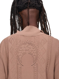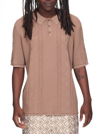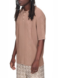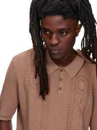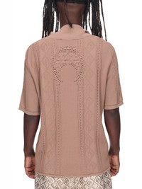 MARINE SERRE shirt in brown, polo design, knit construction, crochet details, signature moon motif, pointed collar, button closure, short sleeves, straight hem, ribbed trim, regular fit. Made in Bulgaria Standard Sizing 75% Viscose, 25% Polyamide Model is 6’0” wearing size L. Shoulders: 18” Chest: 33” Waist: 28”