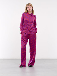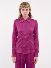 MARINE SERRE blouse in violet, paneled viscose construction, signature moon monogram print, spread collar, front buttoned placket closure, long sleeves, buttoned cuffs, darted bodice, curved hem, slim fit. Made in Romania 100% Viscose French Sizing Model is 5'8" wearing size 34. Bust: 32" Waist: 24" Hips: 34"