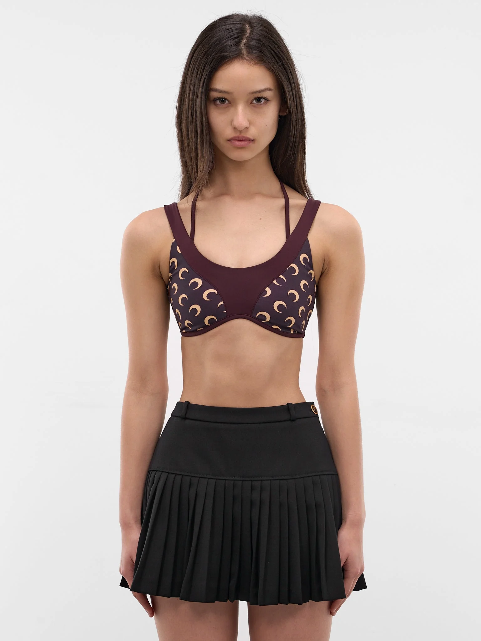 Bra in brown constructed in stretch nylon with moon print and multi-strap design. Featuring: • Slim fit • Stretch nylon construction • Signature moon print • Double halter and shoulder straps • Contrast paneling • Y-strap at back • 65% Polyamide 35% Elastane • Standard sizing Model is 5'8.5" wearing size S. Bust: 32” Waist: 24” Hips: 34”