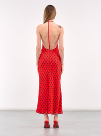 MARINE SERRE dress in red, paneled viscose satin construction, signature moon print, halterneck, sleeveless, armscyes, open back, draped neckline, fluted hem, maxi-length, relaxed fit. Made in Romania 100% Viscose French Sizing Model is 5'9" wearing size 36. Bust: 32" Waist: 23" Hips: 34"