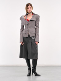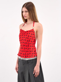 MARINE SERRE tank in red, paneled viscose construction, signature moon monogram print, halterneck, draped neckline, sleeveless, armscyes, open back & strap, flared hem, slim fit. Made in Romania 100% Viscose French Sizing Model is 5'9" wearing size 36. Bust: 32" Waist: 23" Hips: 34"