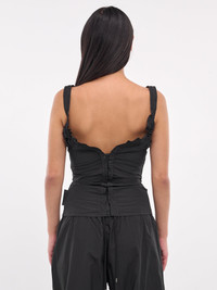 MARINE SERRE tank in black, nylon-cotton blend, paneled construction, sweetheart neckline, shoulder straps, sleeveless, armscyes, front exposed zip closure, front ruching, back adjustable drawstring, side logo flag, curved hem, slim fit. Made in Romania 74% Nylon 26% Cotton French Sizing Model is 5'6" wearing size 36. Bust: 31" Waist: 24" Hips: 34"