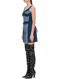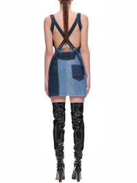 MARINE SERRE dress in blue, patchwork design, stretch-denim, adjustable straps, back cross straps, belt loops, single patch pocket, contrast stitching, gold-tone hardware, mini length, slim fit. Made in France Italian Sizing 98% Cotton, 2% Elastane Model is 5'10" wearing size 36. Bust: 28.5" Waist: 22" Hip: 34.5"