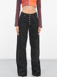 MARINE SERRE black jeans, paneled construction, flared silhouette, non-stretch denim, laser printed signature monogram, high-waist, belt loops, button-fly, four pockets, denim topstitching, wide leg, regular fit. Made in Portugal 100% Cotton Italian Sizing Model is 5'10" wearing size 36. Bust: 32" Waist: 24" Hips: 36"