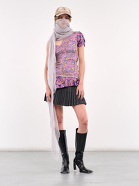 MARINE SERRE skirt in grey, poly-wool blend, paneled construction, belt loops, side button & concealed zip closure, back metal logo plaque, pleated, straight hem, lined, mini-length, slim fit. Made in Italy Main: 52% Polyester 48% Virgin Wool Secondary: 100% Cotton Lining: 100% Viscose French Sizing Model is 5'9" wearing size 36. Bust: 32" Waist: 23" Hips: 34"