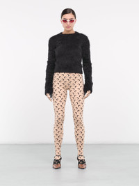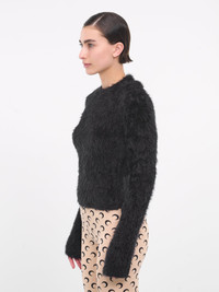MARINE SERRE sweater in black, nylon-blend fluffy knit construction, ribbed crewneck, long sleeves, back contrast knit logo, straight hem, slim fit. Made in Romania 80% Polyamide 14% Viscose 6% Polyester Standard Sizing Model is 5'7" wearing size XS. Bust: 31" Waist: 24" Hips: 30"