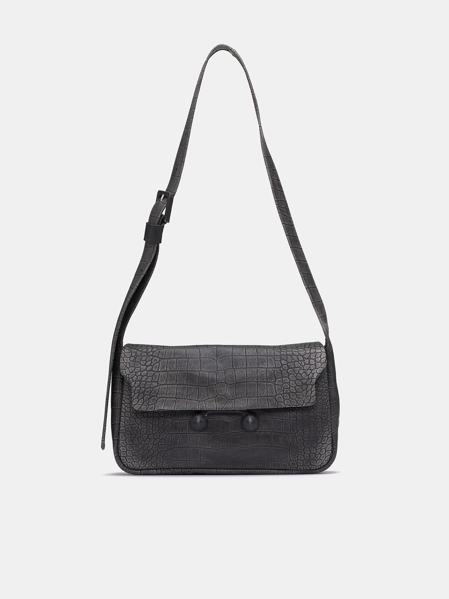 MARNI bag in grey, leather construction, crocodile print, vintage effect, shoulder strap, adjustable pin-buckle, flap closure, logo-engraved magnetic clasp, back pocket, lined. Made in Italy Leather One Size