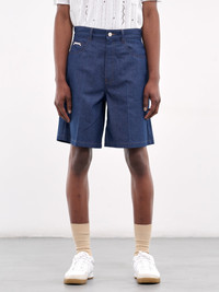 MARNI shorts in blue, paneled denim construction, contrast topstitching, belt loops, back logo patch, front button & concealed zip fly closure, inset pockets, coin pocket & logo flag, back patch pockets, traveler's crease, straight hem, above-knee length, wide leg, loose fit. Standard Sizing Model is 6'1" wearing size 30. Shoulders: 15.5" Chest: 31" Waist: 26"