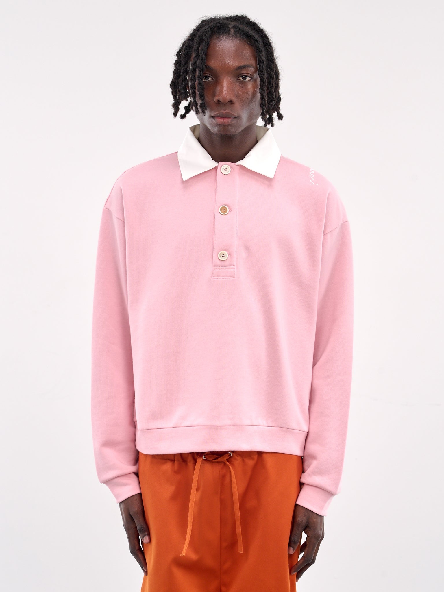 MARNI sweater in pink & white, cotton-poly blend, paneled knit construction, spread collar, front quarter button placket closure, shoulder hand-stitched loog, long sleeves, rib-knit cuffs & hem, straight hem, relaxed fit. Made in Italy 98% Cotton 2% Polyester Italian Sizing Model is 6’2” wearing size 48. Shoulders: 19” Chest: 38” Waist: 28”