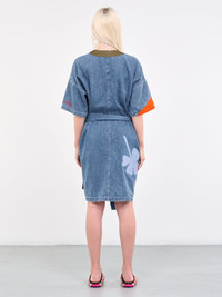 MARNI x NO VACANCY INN coat in blue, overcoat design, wrap silhouette, lightweight stone-washed chambray, multi-color patches, v-neck, drop shoulder, mid-sleeves, tie closure, mid-length, relaxed fit. Made in Italy Standard Sizing 100% Cotton Model is 5'8" wearing size 40. Bust: 30" Waist: 24.5" Hips: 34"