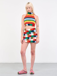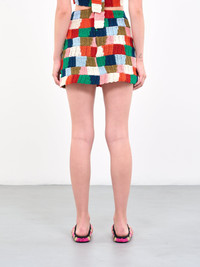 MARNI x NO VACANCY INN skirt in multicolor, open knit construction, color-block pattern, high-waist, mini length, slim fit. Made in Italy Standard Sizing 100% Cotton Model is 5'8" wearing size 40. Bust: 30" Waist: 24.5" Hips: 34"
