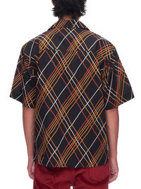 Marni shirt in black, notched lapel collar, short sleeves, relaxed silhouette, front button closure, chest patch pocket, all over stripe graphic print. Made in Italy Italian Sizing Composition: 100% Cotton Model is 6ft 2” and is wearing a size 46. Shoulders: 18” Chest: 35” Waist: 30”