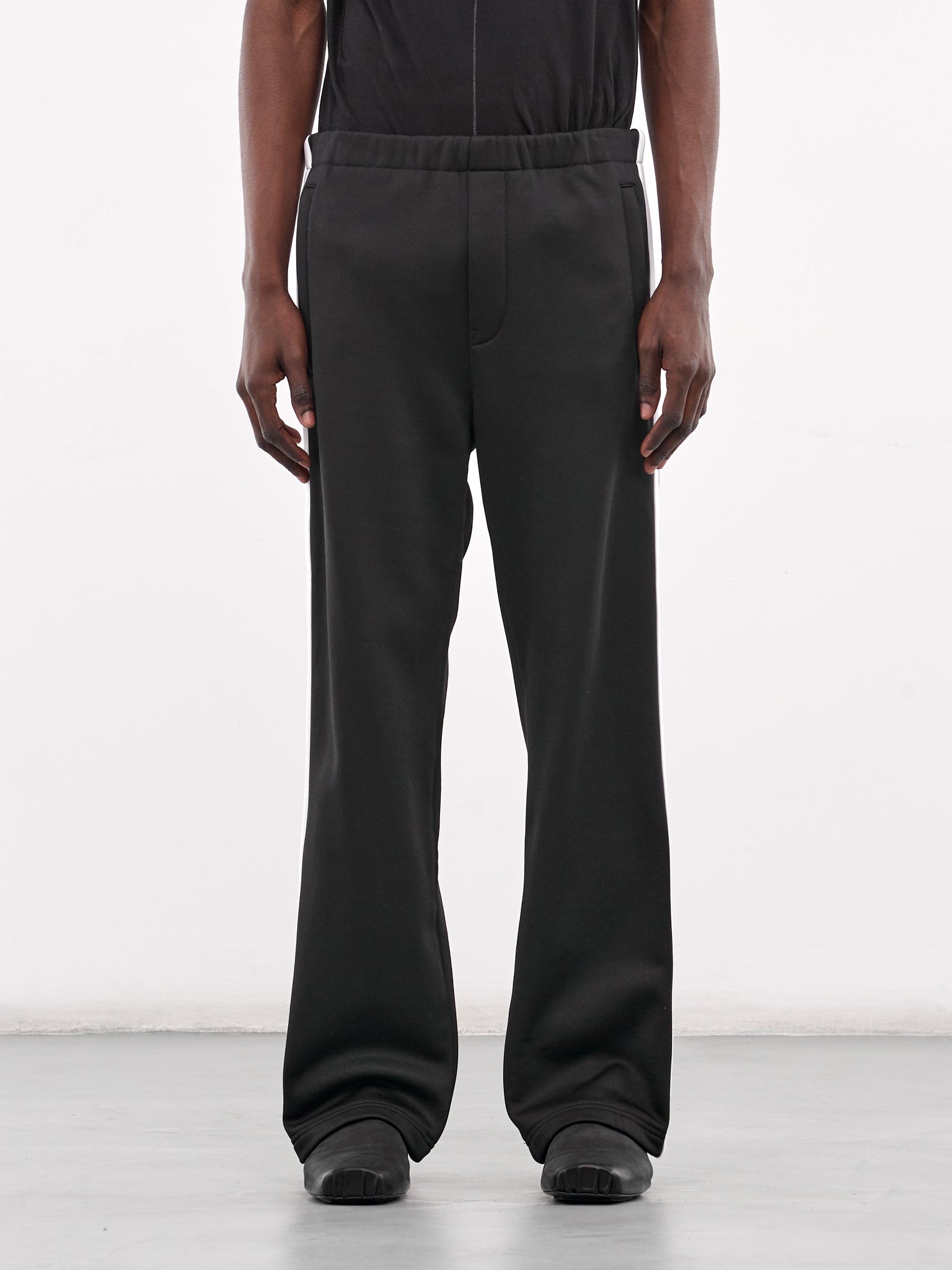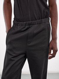 MARNI joggers in black, nylon-cotton blend, paneled construction, elasticated waistband, mock-fly, side welt pockets, back welt pocket, side piping, straight leg, relaxed fit. Made in Italy 59% Polyamide 41% Cotton European Sizing Model is 6’2” wearing size 46. Shoulders: 19” Chest: 38” Waist: 28”