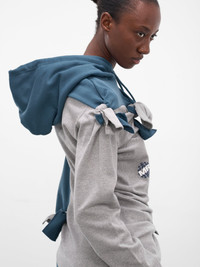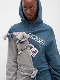 An asymmetrical hoodie in contrasting grey and blue panels with a reconstructed silhouette. Features hand-tied knot detailing throughout, screen-printed graphics, and dual branded drawstrings. Featuring: • Oversized fit • Cotton construction • Asymmetrical two-tone paneling • Reconstructed silhouette with knot detailing • Screen-printed logos and playing card graphics • Dual hood drawstrings with Martine Rose branding • Ribbed cuffs and hem • Made in Portugal • 100% Cotton • Standard sizing Model is 5'11" wearing size S. Bust: 31.4" Waist: 24.8" Hips: 35"