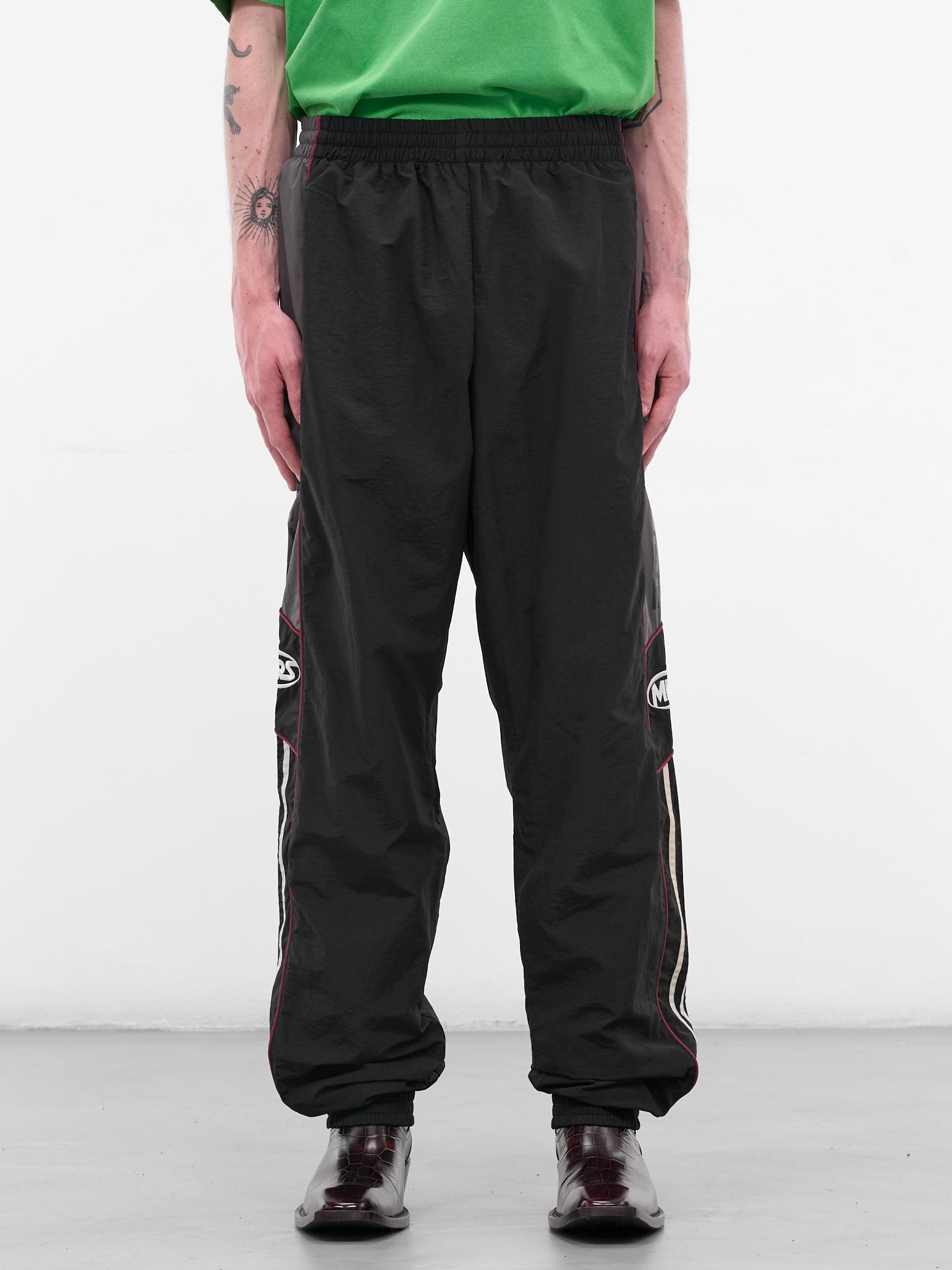Black sweatpants with a baggy wide-leg silhouette. Finished with stripe detailing and logo embroidery at the sides. Featuring: • Baggy fit with wide leg • Polyamide construction • Elasticated waistband • Side pockets • Stripe detailing and logo embroidery at sides • Elasticated cuffs • Made in Morocco • 100% Polyamide • Standard sizing Model is 6'0" wearing size M. Shoulders: 17" Chest: 30" Waist: 28"