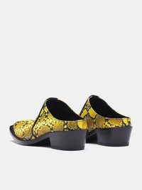 MARTINE ROSE shoes in yellow & black, cowboy mules design, leather construction, snakeskin embossing, low-cut, slip-on style, open heel, western style paneling, pointed square toe, cuban heel, leather & rubber sole, lined. Italian Sizing