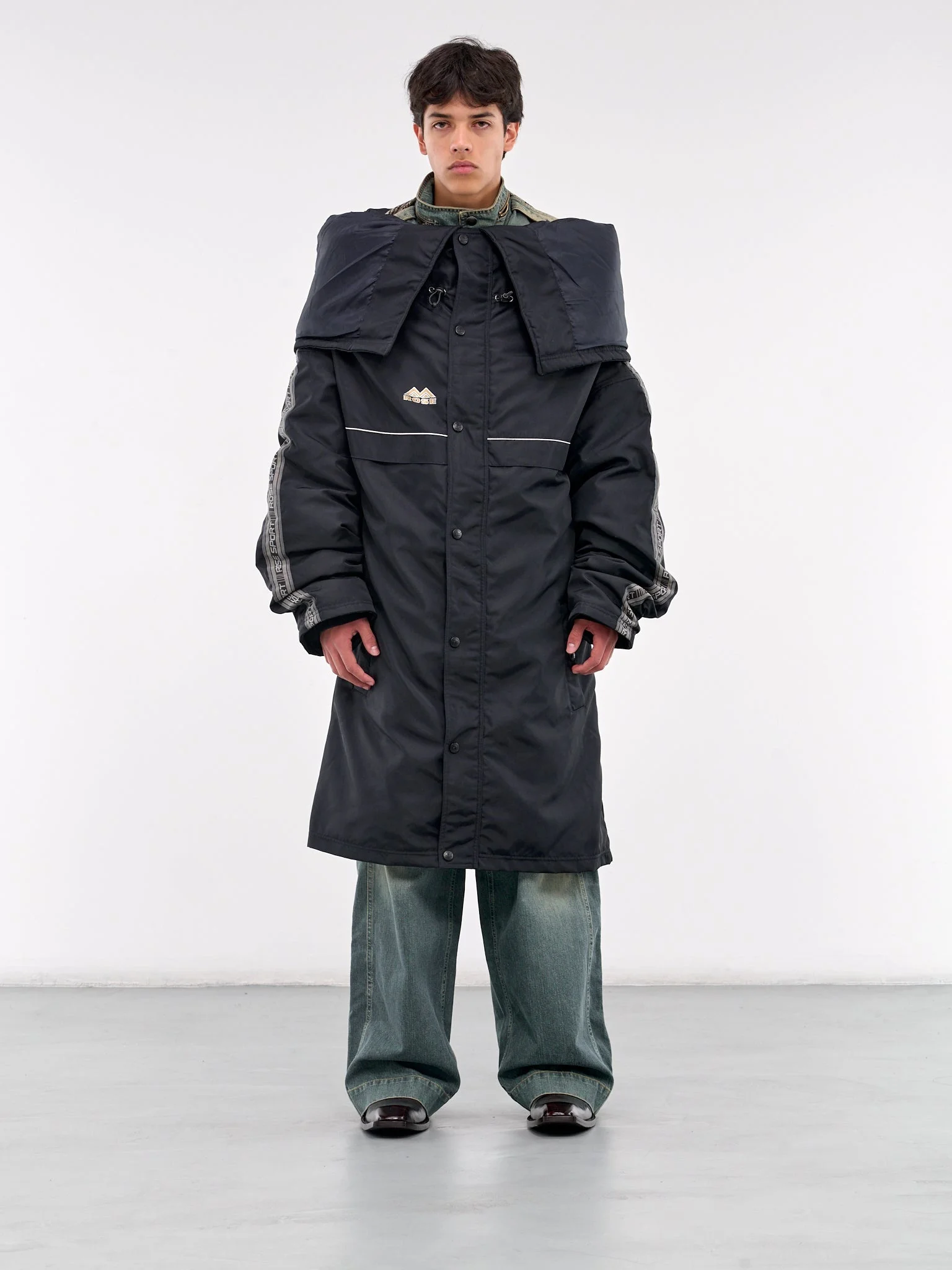 MARTINE ROSE coat in black, paneled nylon construction, off-shoulder collar, front button placket closure, long sleeves, logo piping, chest logo detailing, side welt pockets, straight hem, lined, mid-length, relaxed fit. Made in Portugal Outer: 100% Polyamide Inner: 65% Acetate 35% Viscose Standard Sizing Model is 6'0" wearing size M. Shoulders: 18.5" Chest: 37" Waist: 29"