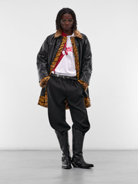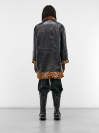 Featuring: • Slim fit • Short length • Reversible design • Tiger stripe pattern • Logo patches at hems • Spread collar • Front button closure • Long sleeves • Side buttoned flap pockets • Interior side pockets • Made in Italy • Main: 100% Calf Leather | Contrast: 67% Cotton 33% Viscose | Contrast 2: 100% Recycled Polyester | Lining: 100% Cotton • Standard sizing Model is 6’2” wearing size M. Shoulders: 19” Chest: 38” Waist: 28”