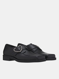 MARTINE ROSE loafers in black, leather construction, full-grain, low-top, slip-on style, heart-shaped pin-buckle, square toe, block heel, lined. Made in Portugal 100% Leather European Sizing