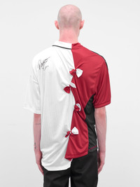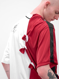 A red and white reconstructed football jersey in polyester with contrasting halves joined by knots across the body. Designed with a fold-down collar, button placket, and seasonal artwork at the chest. Featuring: • Oversized fit • Polyester construction • Contrasting collaged jersey halves • Knot detailing throughout • Crewneck with fold-down collar • Button placket • Seasonal artwork at chest • Jacquard “Expect Perfection” design • Made in Portugal • 100% Polyester • Standard sizing Model is 6'0" wearing size M. Shoulders: 17" Chest: 30" Waist: 28"