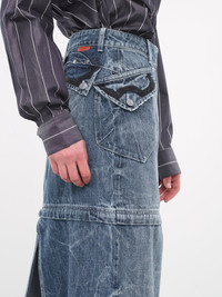 MARTINE ROSE blue skirt, versatile wear, detachable lower panel, non-stretch denim, washed treatment, contrast topstitching, mid-waist, belt loops, exposed zip-fly, flap pockets, back adjustable buckle, woven logo label, contrast topstitching, maxi length, regular fit. 100% Cotton Standard Sizing Model is 5'11" wearing size XS. Bust: 32" Waist: 24" Hips: 34"