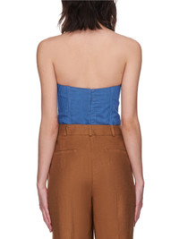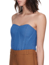 Maryam Nassir Zadeh top in blue, sleeveless design, back hook and eye closure, boning/ribbed support at bust, all over stripes, straight/finished hem, tonal stitching. Made in the United States. Standard Numeric Sizing. Composition - 81% Cotton, 19% Silk. Model Measurements: Model is 5ft 7” and wearing a size 0. Bust: 32” Waist: 24” Hip: 33"