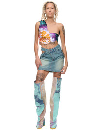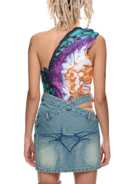 MASHA POPOVA top in multicolor, embroidered butterfly design, asymmetric neckline, raw edges, contrasting shoulder & side snap button fastening, cropped, fitted. Standard Sizing 100% Viscose Model is 5'9.5" wearing size S. Bust: 32" Waist: 26" Hip: 35"