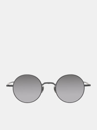 MATSUDA sunglasses in silver, round design, lightweight rim wire frame, silver mirror lenses, adjustable nose pads, logo engraving, hard case & cleaning cloth included. Made in Japan 100% Titanium 46.22.140