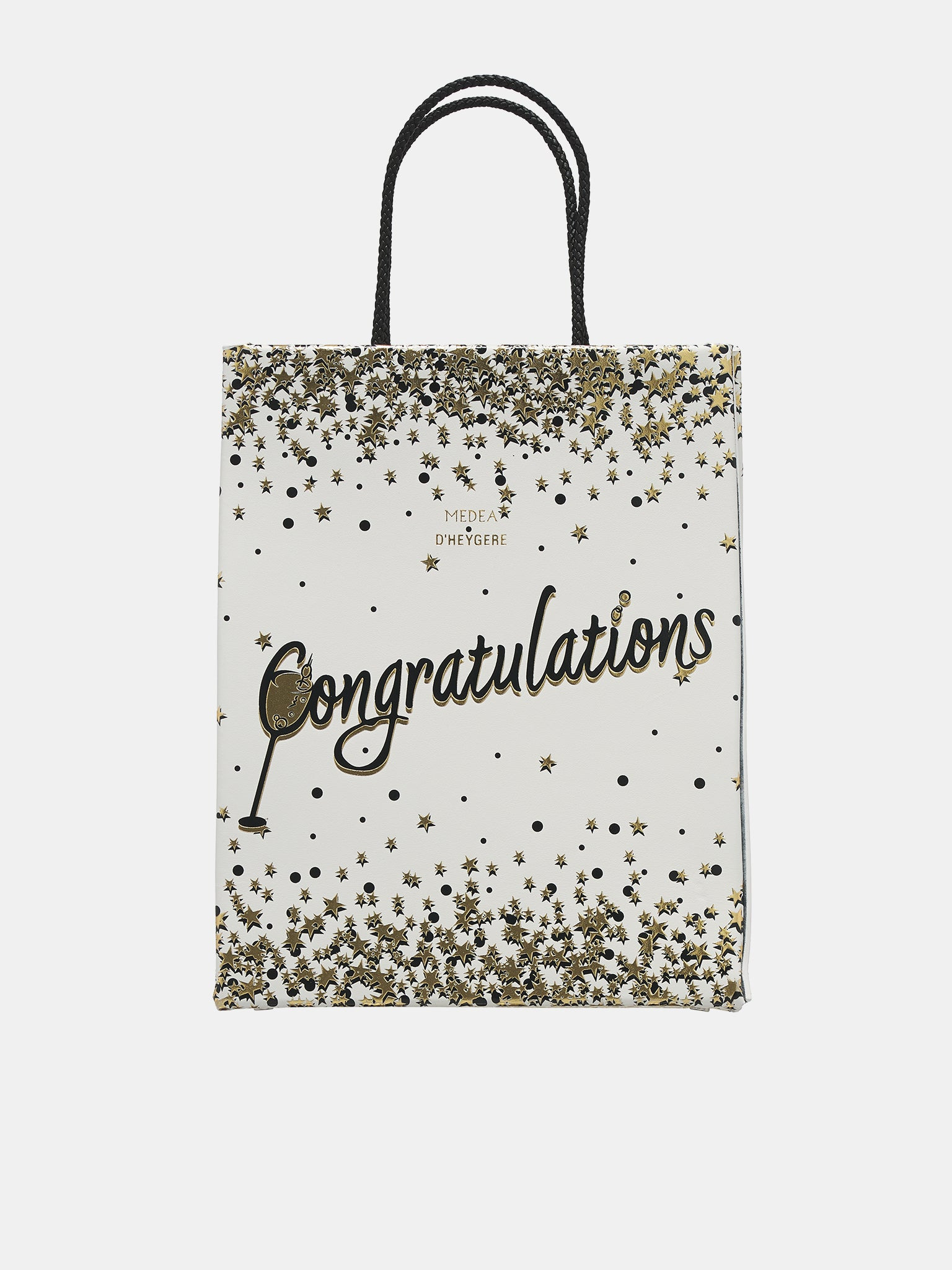 MEDEA x D'HEYGERE bag in white & gold, leather construction, trompe l'oeil gift bag design & print, twin fixed straps, logo embossing, detachable crossbody strap, lined. Made in Italy 100% Calf Leather One Size